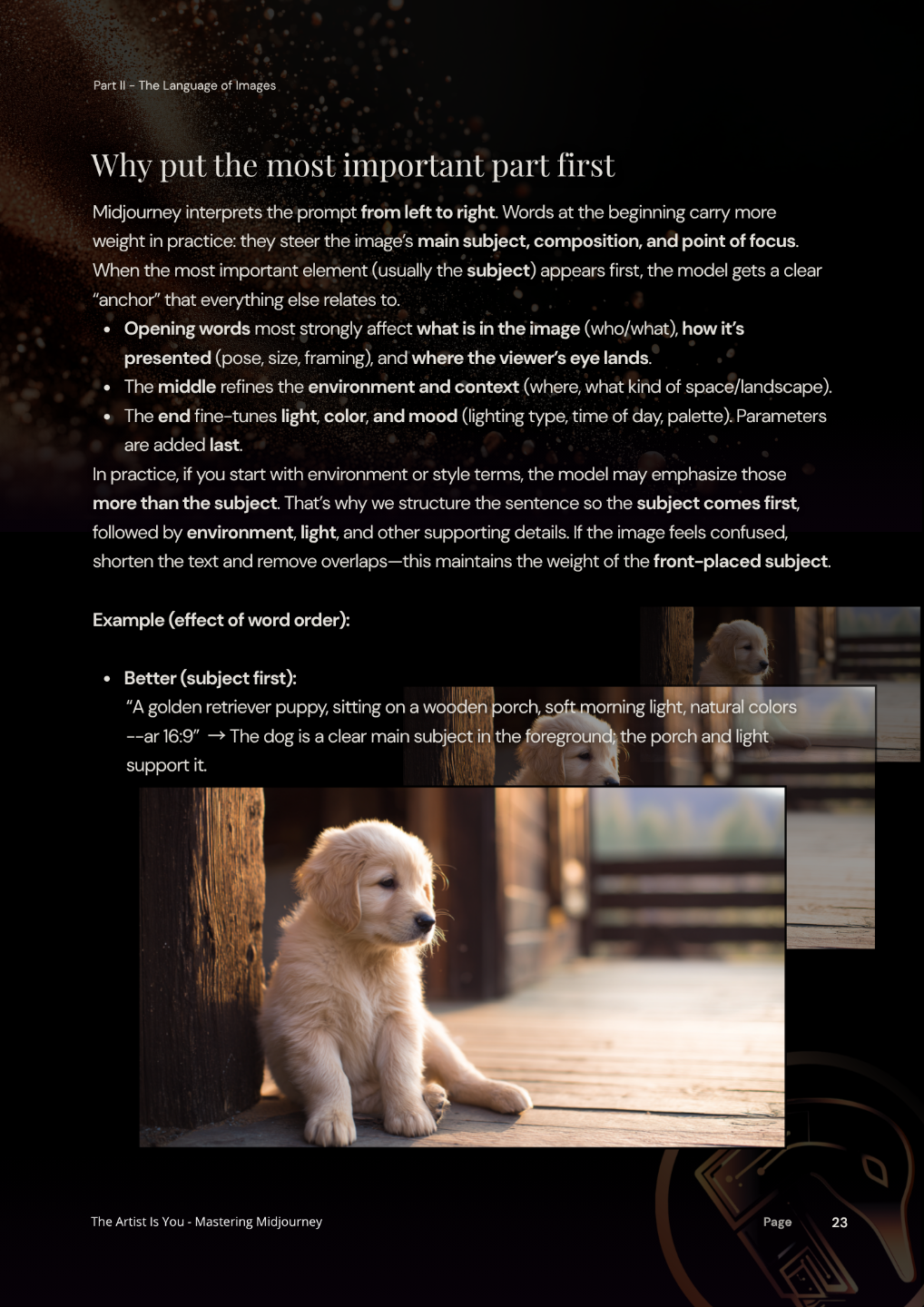 The guide is divided into 11 chapters that walk you through the entire Midjourney image creation process – from interface basics to prompts, parameters, camera angles, lighting, and color harmonies. Each chapter builds on the previous one, so you always know what to do next and why you’re doing it. Early chapters give you a solid foundation in what AI art actually is and how Midjourney “thinks”. Later chapters dive deep into prompts and parameters – and toward the end, we return to the ethical side of AI images, so you know how to use these tools responsibly.