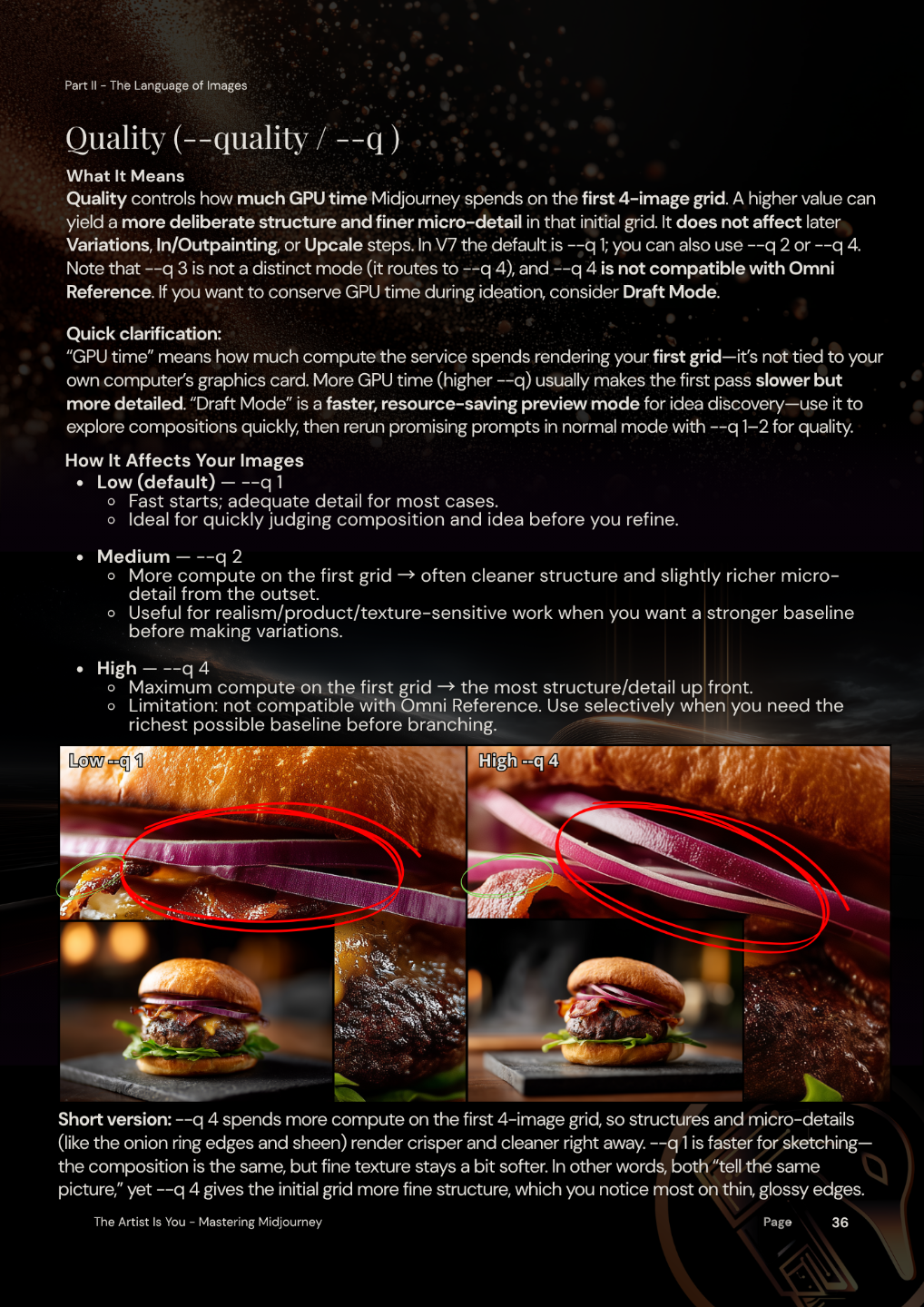 You’ll get practical exercises, +100 ready-to-use prompt frameworks, and simple formulas, but most importantly, visual explanations. Throughout the guide, you’ll see side-by-side image examples where key parameters – like Aspect ratio, Stylization, Chaos or Quality – are explained one at a time, so you can immediately see what each setting does to the final result. Topics that usually feel overwhelming are turned into clear, step-by-step instructions you can actually follow.